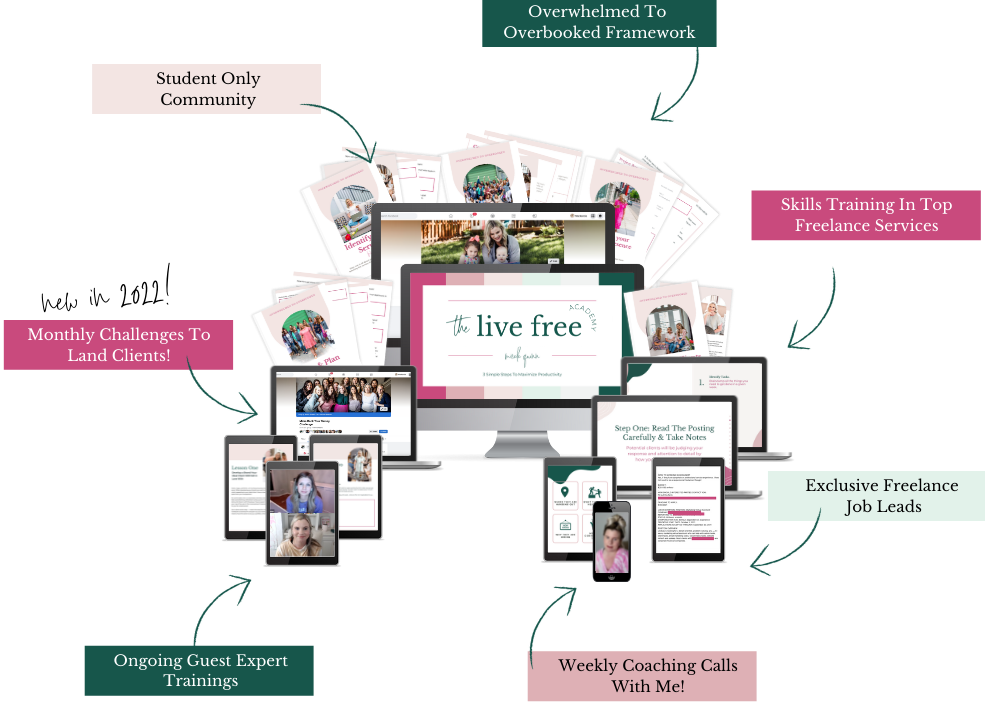 When you step inside the Live Free Academy - I promise to provide you with every level of support you need to make freelancing work for you. This program is intentionally designed with multiple levels of support across platforms to give you access to the coaching and encouragement you need.